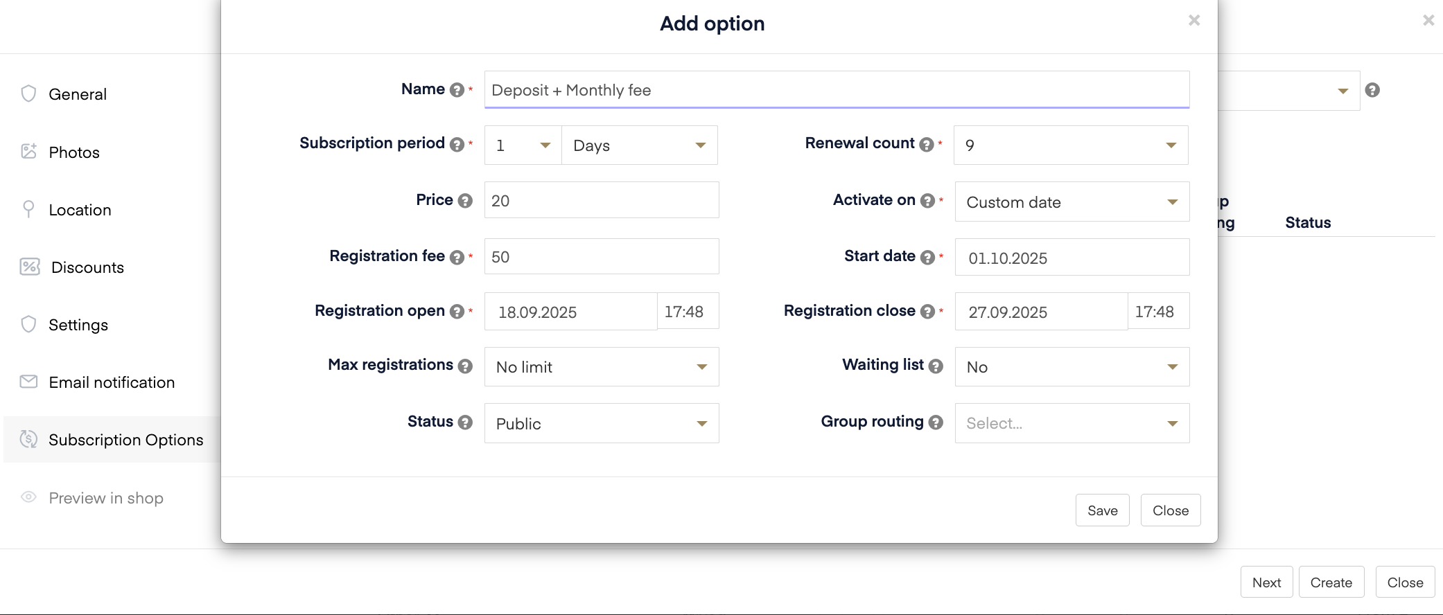 In Abler you can now set up a registration fee when creating a subscription. This is an upfront fee that the customer pays at the time of booking. Some clubs might call it an admin fee or a deposit, but in Abler we call it the Registration fee.