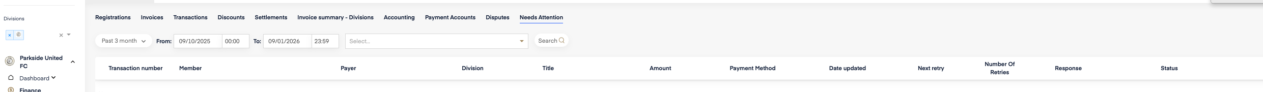 The Needs Attention view helps clubs monitor failed card payments and see exactly where each payment is in the retry process.