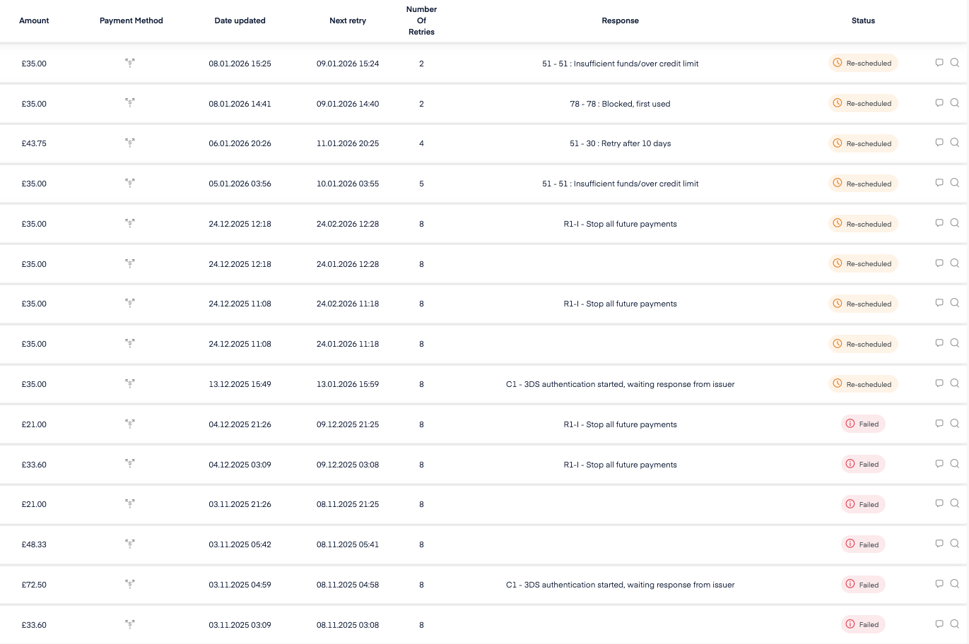 This makes it easy to understand which payments are still being retried automatically and which subscriptions have stopped and require action.