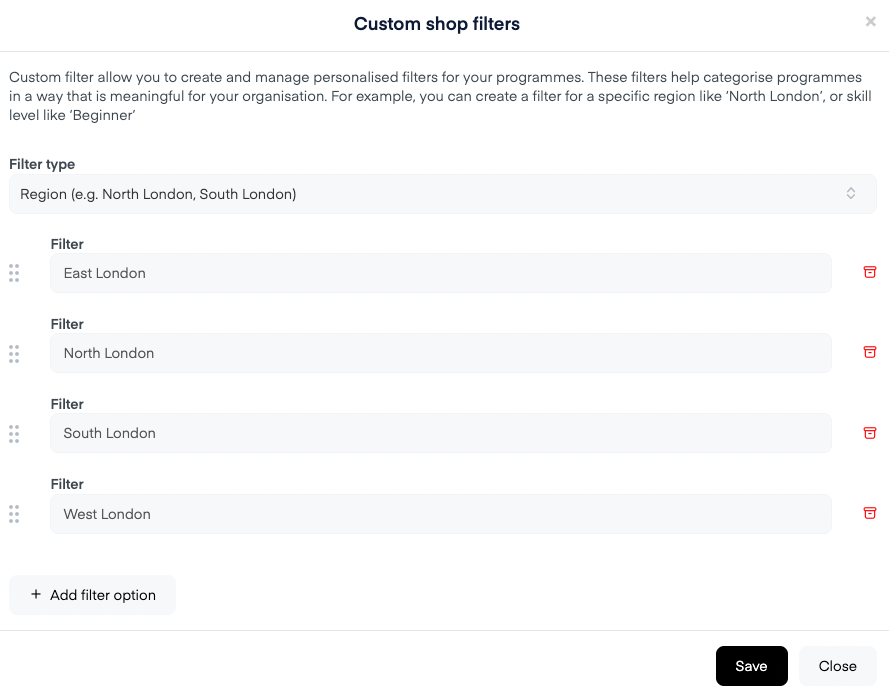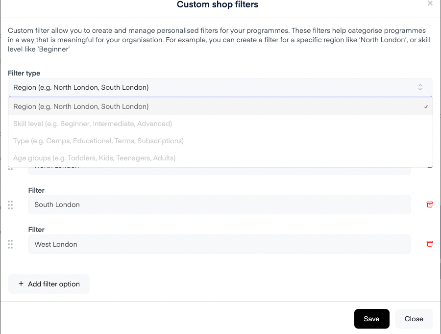 Add your desired filter values (for example, “North London” or “Beginner”). You can choose as many as you want.