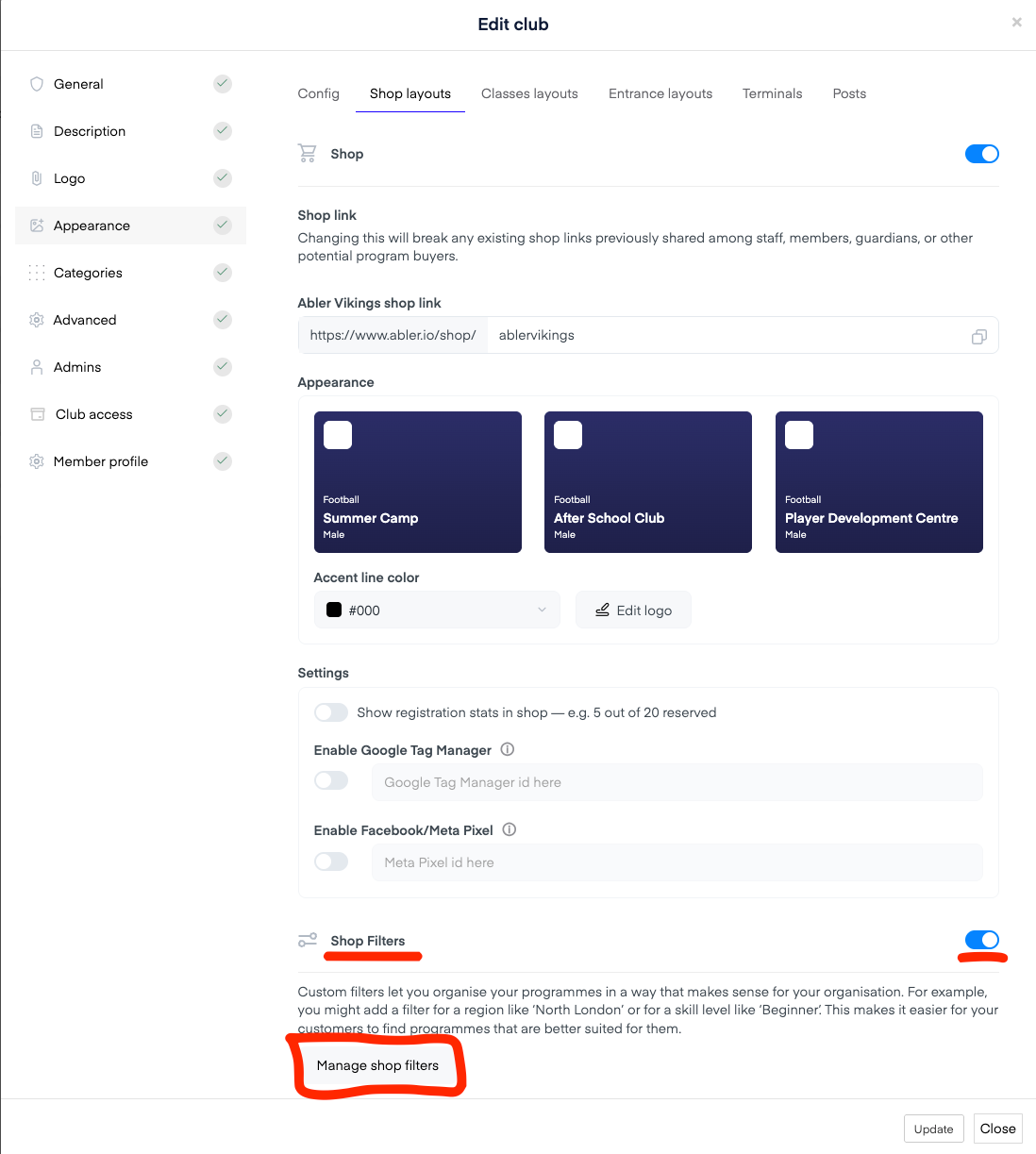 Under Appearance → Shop Layouts, scroll down to “Manage filters”