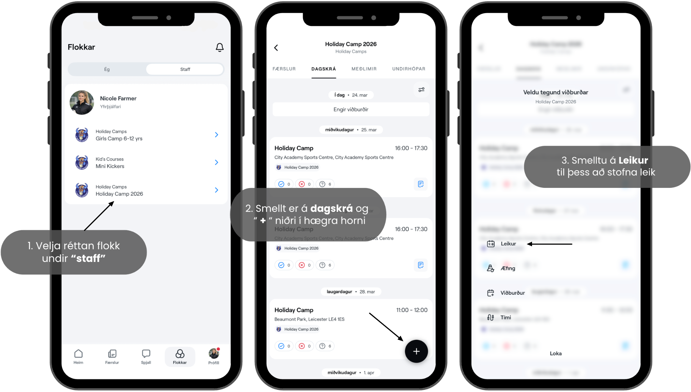 Hægt er að stofna leik bæði í appinu og í tölvu, hvort sem um er að ræða æfingaleik, mótsleik eða annan skipulagðan leik. Þetta gerir þjálfurum kleift að halda utan um leiki á einfaldan hátt og tryggja að allir fái nauðsynlegar upplýsingar varðandi leikina. Hér fyrir neðan eru leiðbeiningar um hvernig ferlið virkar.