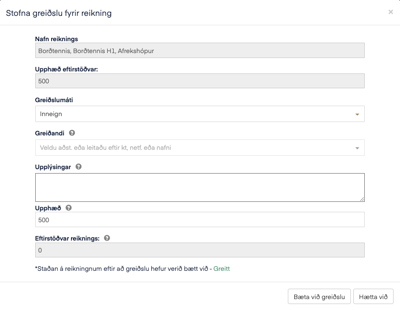 4. Svo er upphæðin sem þau eiga inni sett inni í reitinn: Upphæð og smellt á Bæta við greiðslu.