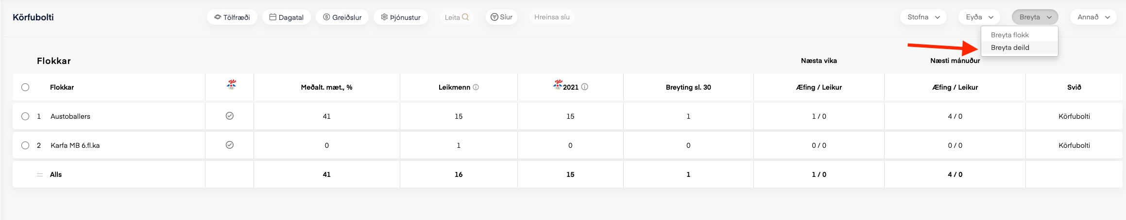 Ef það þarf að breyta því eða á eftir að tengja það við sérsamband þá þarf að ýta á deildina og svo ,,Breyta deild''.