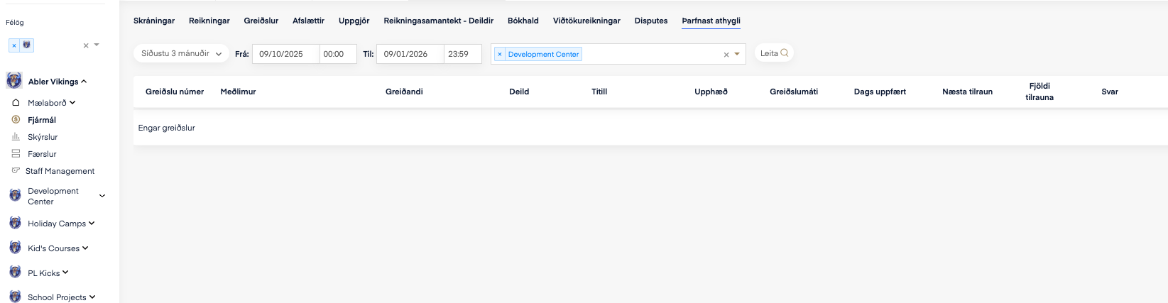 Hér má sjá hvort greiðslur séu enn í sjálfvirkri innheimtu eða hvort áskriftir hafi stöðvast og krefjist frekari aðgerða.