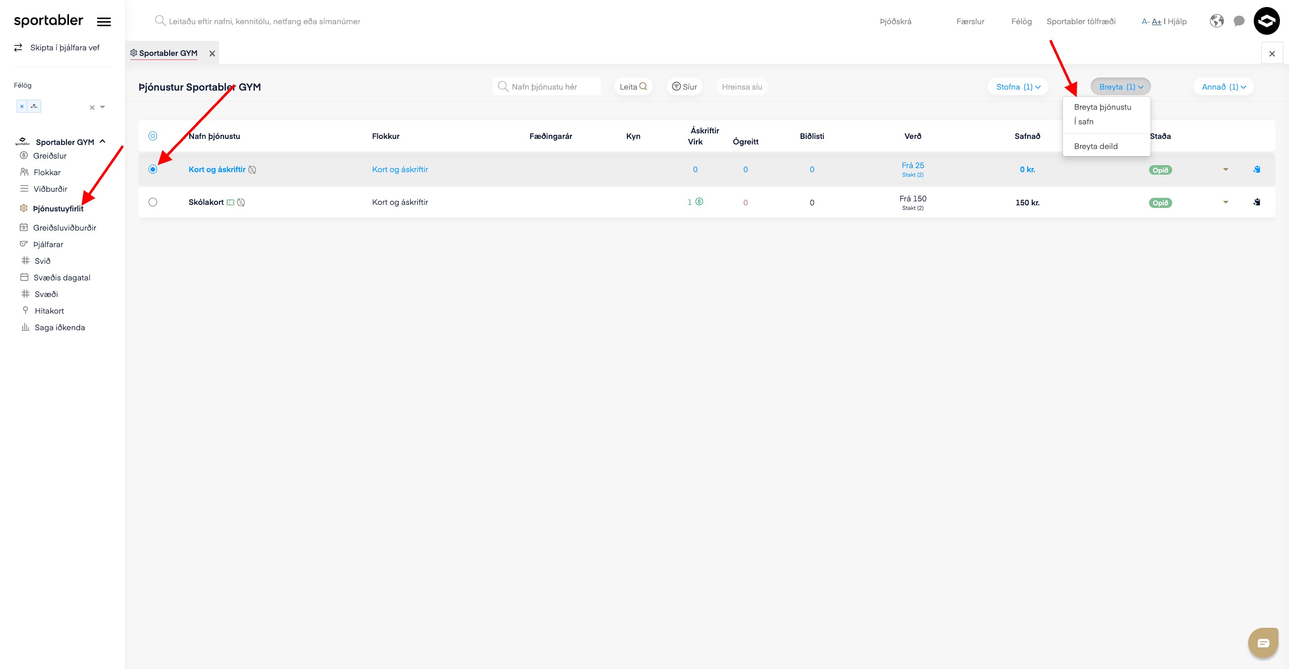 Til að virkja eiginleikann á þjónustunni er smellt á þjónustyfirlit og valið að breyta þjónustu.