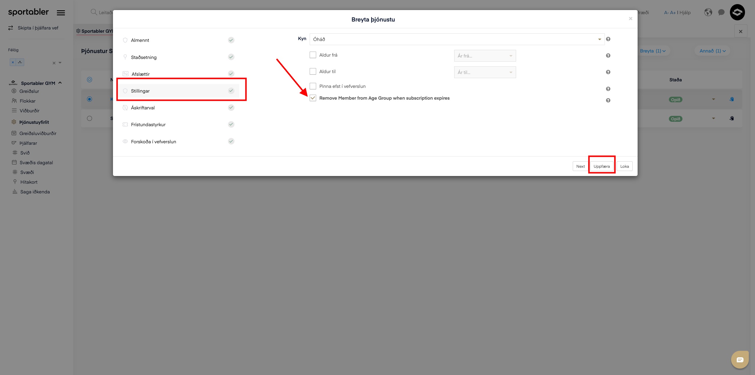 Í kjölfarið er smellt á stillingar í vinstri stikunni og hakað í "Remove member from age group when subscription expires" og ýtt á uppfæra.